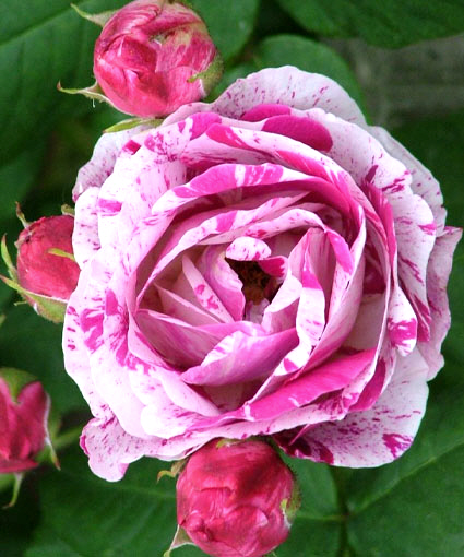 Die Blüten sind rosa mit unregelmäßig verteilten karminroten Flecken und Streifen. Keine Blüte gleicht der anderen. Die leicht gefüllten Blüten wirken als Knospe elegant.Sie gehört zu den gesündesten Alten Rosen. Ihr Duft ist kräftig süß. |