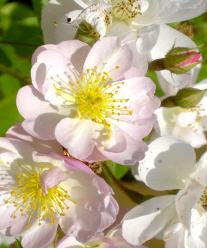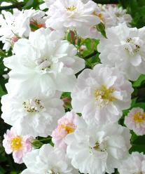 Diese Rose entstand in Oxfordshire dem Garten der einflussreichen Designerin Brenda Colvin. Die kleinen Blüten erscheinen in großen, fülligen Sträußen, sodass sie eine beeindruckende Gesamtwirkung erzielen. Die Blüten sind halbgefüllt und weiß mit rosa Rückseiten, die an Apfelblüten erinnern. Der Duft ist süß.