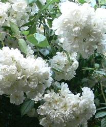 Züchter: Colvin, Großbritannien, 1970 Blüte: weiß halbgefüllt, einmal blühend, starke Nachblühte, Duft nach Moschus Pflanze: starkwüchsig, rankend, Höhe: ca. 5 m