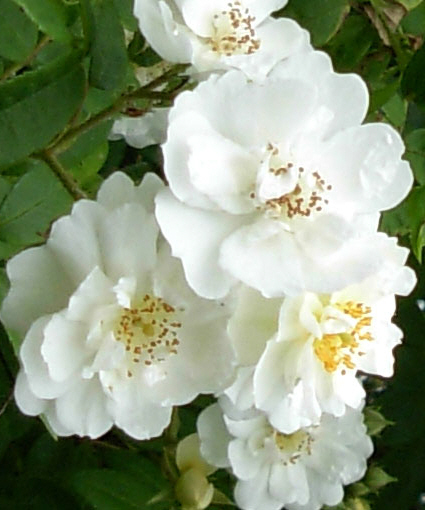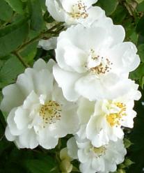 Der Ursprung dieser beliebten Kletterrose, die an einem Baum bis zu 6m hoch wird, ist wahrscheinlich der Garten eines irischen Pfarrhauses gewesen. Rambling Rector bildet große, duftige ( kräftig nach Moschus) Blüten. Sie sind anfangs cremeweiß mit leuchtend gelben Staubblättern, werden aber schnell reinweiß. Später entwickeln sich zahlreiche kleine, orangefarbene Hagebutten.