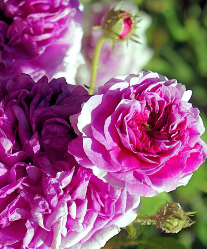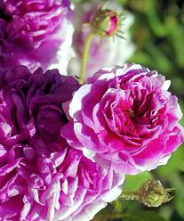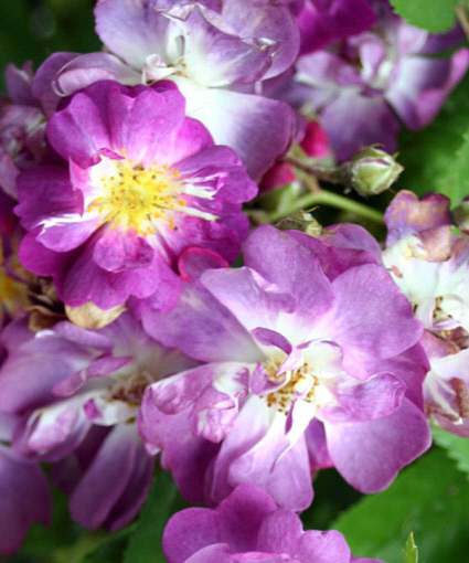 Veilchenblau ist die bekannteste, am häufigsten gepflanzte violette Rambler-Rose. Die Blüten sitzen lange an der Pflanze. Die meisten Blüten haben breite weiße Streifen, die sich vom weißen Zentrum bis in die Spitzen ziehen. Im Herbst entwickeln sich kleine, orangefarbene Hagebutten. Sie gedeiht bei extremer Hitze und Kälte und verträgt Schatten.